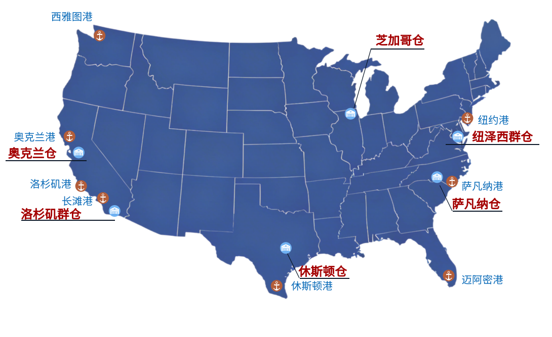 奥克兰仓、洛杉矶仓群、休斯顿仓、萨凡纳仓、纽泽西仓群、芝加哥仓